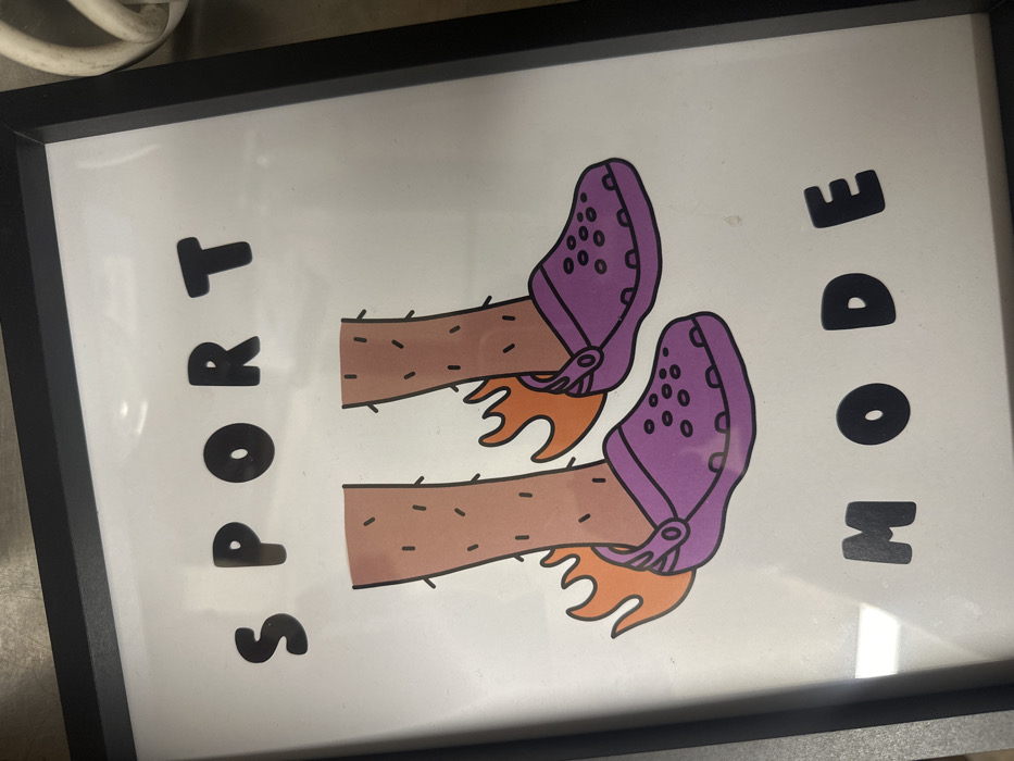 A vertically oriented, black-framed print with a clear cover displays a white background featuring a cartoon illustration. The top of the print reads 'SPORT' in bold, rounded black capital letters. Below this, two light brown cartoon legs with short black hairs are depicted, each wearing a purple, perforated, Crocs-style sandal. Orange flames emanate from behind the heels of both feet. The bottom of the print reads 'MODE' in matching bold, rounded black capital letters. The framed print is positioned against an indistinct background surface, with a segment of a white coiled cable visible in the upper right. This scene is located in the city of Salisbury, United Kingdom.