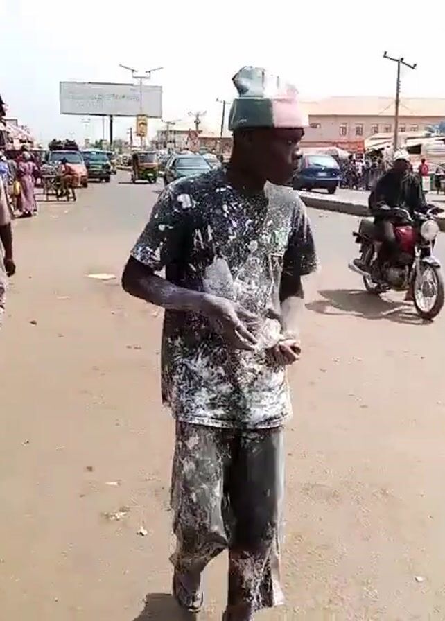 young man standing on the side of a street in an urban area. He's covered in white paint splatters, wearing a paint-splattered shirt and pants, and a colorful hat. He appears to be fiddling with something in his hands. The street is busy with traffic including cars, motorcycles, and auto-rickshaws. There are buildings and people visible in the background, suggesting a commercial or market area.