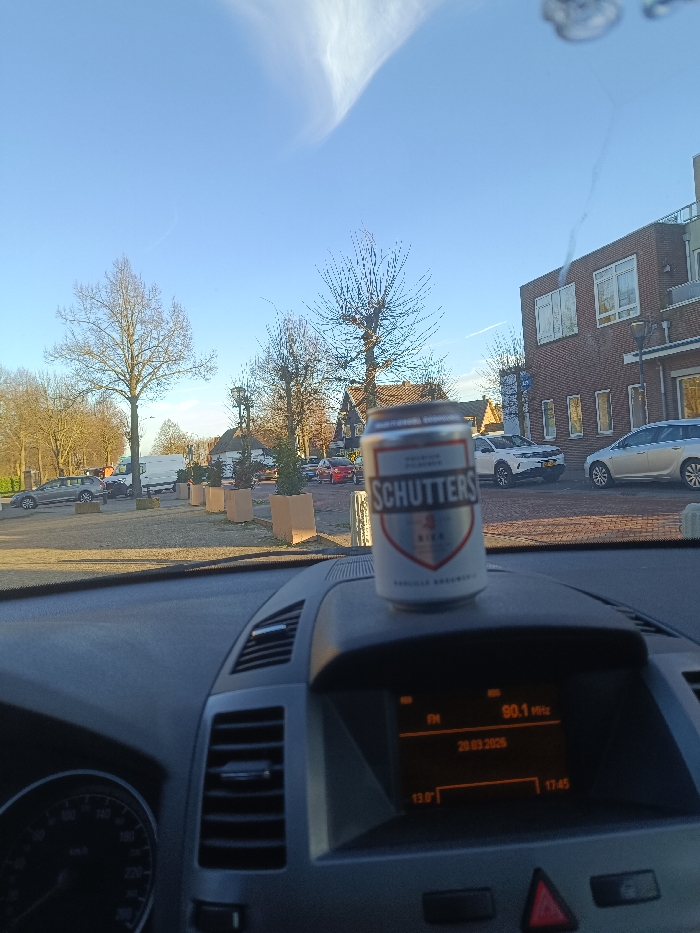 The image presents a view from inside a vehicle, looking through a windshield on a sunny afternoon. A silver "SCHUTTERS BIER" can, featuring a red and white shield logo, stands prominently on the dark grey dashboard's central console. Below the can, the car's digital display shows "FM 90.1 MHz," the date "20.03.2025," the temperature "13.0°," and the time "17:45." A red hazard light button is partially visible at the bottom. Outside the vehicle, a clear blue sky dominates the upper portion, featuring a faint, wispy contrail in the upper left. The external environment depicts an urban street or square lined with bare deciduous trees, suggesting late winter or early spring. To the right, a multi-story brick building with white-framed windows is visible. A paved area, likely a parking lot, occupies the mid-ground, where several vehicles are parked, including a silver hatchback/wagon, a white SUV, a grey car, and a white van. A row of light-colored planters with small plants runs along the edge of this paved area. No individuals are visible. The scene is identified as **Dorpsstraat in Rheden, Netherlands**, specifically looking north or northwest from a parked vehicle, with the brick building on the right being consistent with structures along the east side of Dorpsstraat, and the paved area functioning as a public space or parking lot.