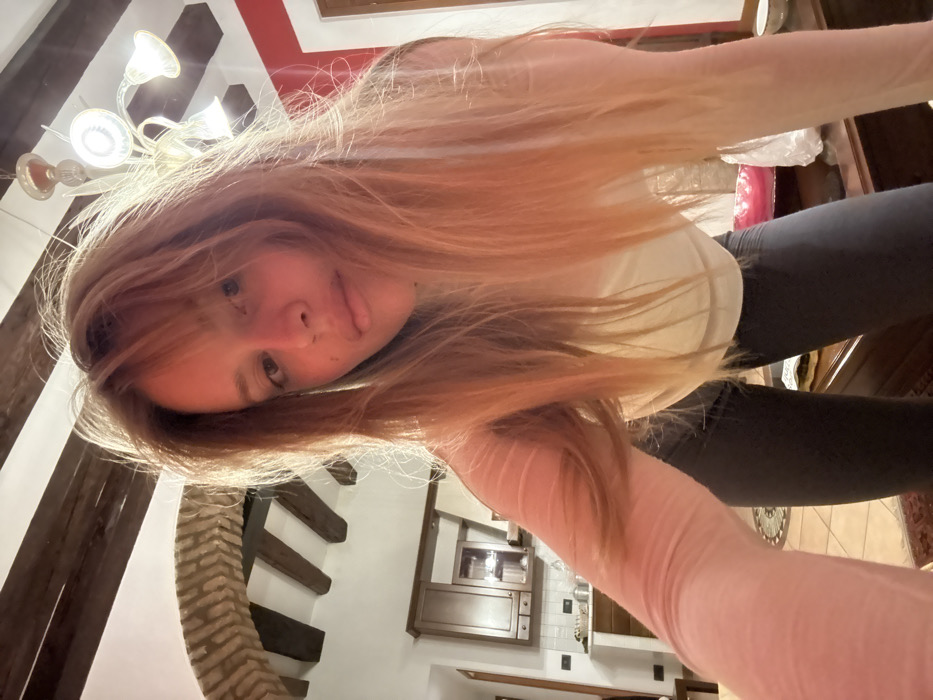 A young woman with long, light-brown hair is captured in a selfie. She wears a white top and dark leggings. The background includes a room with dark wooden beams on the ceiling and a chandelier. A kitchen area is visible in the distance with cabinets and appliances. The composition has a slight tilt, creating a dynamic and casual feel.