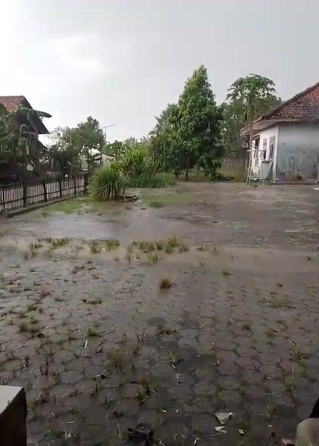 rainy day in a residential area. The camera is static and faces a large, mostly flat, open space that appears to be a yard or field. The ground is mostly covered in dark, possibly paved material, with patches of standing water reflecting the overcast sky. Some grass and weeds grow sparsely throughout the yard. In the background, there are several trees of varying sizes and types. To the left, a house is partially visible behind a dark-colored fence. To the right, another house with a white exterior and a red tile roof is visible. A ladder leans against the side of the house. The sky is a uniform gray, indicating heavy cloud cover, and rain is falling steadily. The sound of the rain is audible. There are no people visible in the frame.