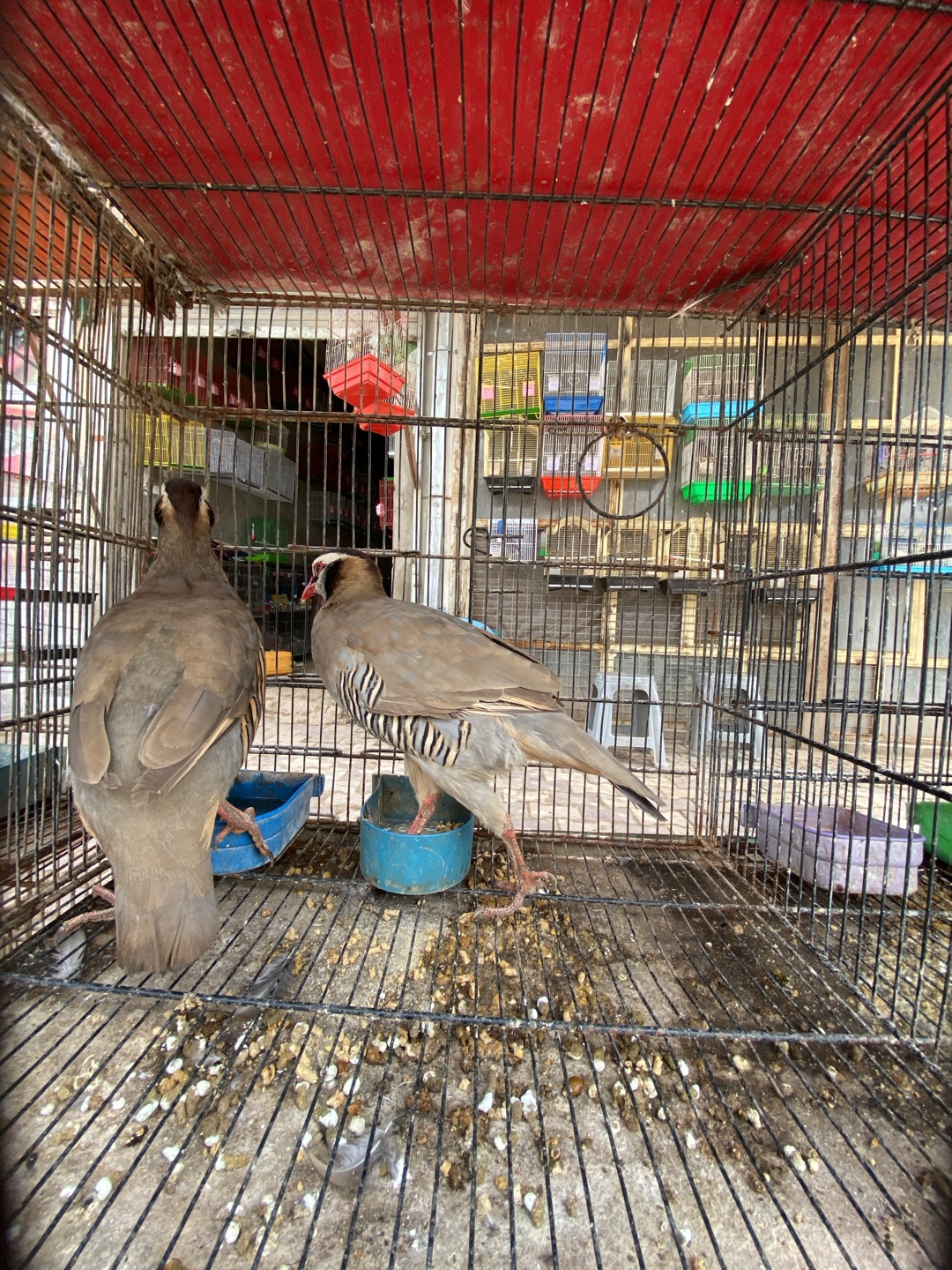 The image displays two Chukar partridges (Alectoris chukar) contained within a black wire cage, positioned beneath a red corrugated roof structure, indicative of an outdoor or semi-outdoor market stall in Kandahar, Afghanistan. The bird on the left is seen from the rear, exhibiting uniform grey-brown plumage. The bird on the right faces rightward, presenting a distinct pattern of black and white vertical stripes on its flanks, a white throat outlined by a dark, reddish-brown band extending from the eye, and light brown upperparts. Both birds stand on the wire grid floor of the cage. The cage floor is extensively soiled with numerous dark bird droppings and scattered food particles. Two plastic dishes are present on the cage floor: a blue circular dish near the center, and a light purple rectangular dish towards the right side. The background reveals additional, smaller wire birdcages of various colors (red, yellow, blue, green), stacked and hanging against an indistinct, light-colored building facade, confirming a commercial setting specializing in birds.