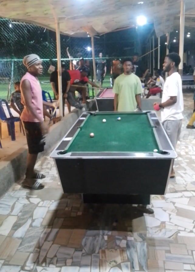 The scene appears to be an outdoor recreation area with a pool table as the central focus. The video is shot from a low angle and rotated. There are several individuals present, one poised to take a shot at the pool table. Other individuals are standing around observing the game. The lighting is bright with overhead lights. The ground is paved with a mosaic tile pattern. The overall atmosphere seems casual and social.