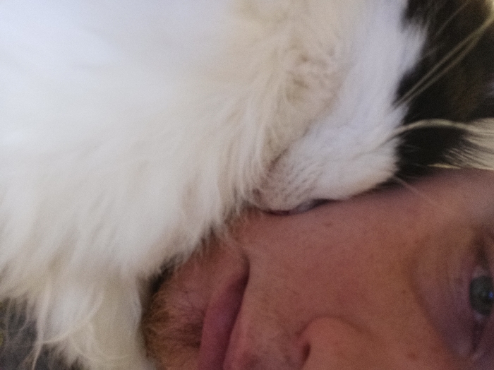 A close-up shows a person's face with a cat resting on their forehead and cheek