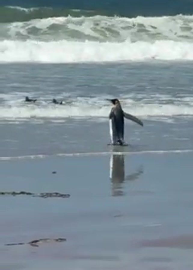 The video depicts a King Penguin standing in shallow water on a beach
