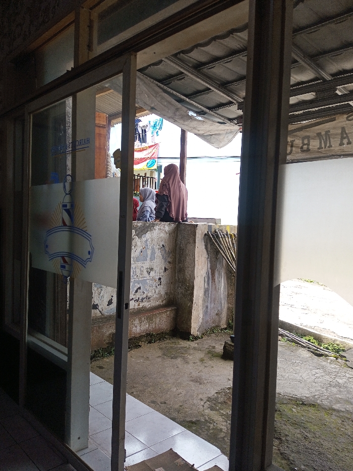 A partial view through a glass door reveals a scene outside. Two women, one in a brown hijab and another with a gray headscarf, sit atop a weathered, concrete wall. Behind them, a sunlit vista features a banner strung between buildings. The exterior ground is concrete with visible moss and plant growth. The door displays a barber pole symbol.