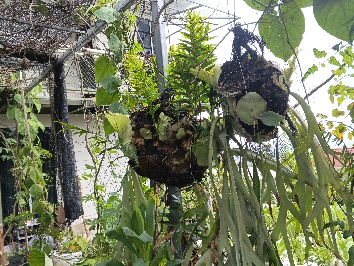 This image captures a dense, cultivated outdoor plant environment located in Ho Chi Minh City, Vietnam. Two prominent, large, spherical masses of *Platycerium* (Staghorn Ferns) are suspended in the midground, with multiple fronds extending downwards. The specimen on the right displays elongated, pendulous fertile fronds and basal shield fronds, characteristic of mature growth. Various other leafy green plants, vines, and smaller ferns are intermingled throughout the scene, growing from the hanging fern masses and climbing on structures. In the background, a metal framework, partially covered by vines and a dark mesh shade net, is visible. Behind this greenery, sections of white building structures and a distant reddish roof are discernible. The sky is partially visible through gaps in the foliage at the top. No individuals are present in the frame.