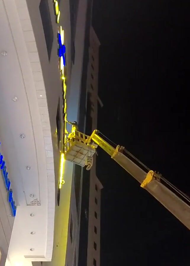 The video captures a nighttime scene where maintenance or repair work is being performed on the exterior signage of a building identified as "Inn Hotel". A yellow KATO-branded crane with a work basket is positioned next to the building. A worker is visible in the basket, working on the illuminated lettering of the hotel sign. The building is a multi-story structure with a white facade. The environment is dark, with the building's lighting illuminating the immediate area. A second, similar high-rise building is visible in the background.