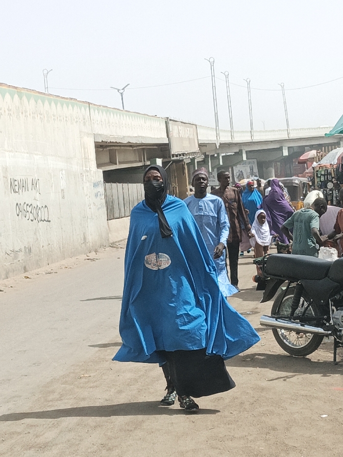 The image depicts an outdoor scene on a dusty thoroughfare in Fagge C, Nigeria, under a bright, hazy sky. In the foreground, slightly left of center, a person wearing a flowing, vibrant blue outer garment over black attire walks towards the right. Their face is largely obscured by a black fabric mask or veil, revealing only their eyes. They wear dark sandals or shoes. Immediately behind this individual, a man in a light blue tunic and a reddish-patterned cap walks in the same direction. Further back, another man in darker clothing follows. On the far left, a light-colored building wall displays graffiti-like text, including "NEMAN AKI" and the number "0915530822." Above this wall, a concrete structure, possibly an elevated roadway or bridge, features a decorative patterned barrier. In the mid-ground right, a crowd of people is visible, including women in various colored hijabs (blue, purple) and a small child in a white head covering, congregating near what appear to be market stalls. A black motorcycle is parked on the far right, with its rear wheel and exhaust clearly visible. Tall, slender light poles are silhouetted against the sky in the background.