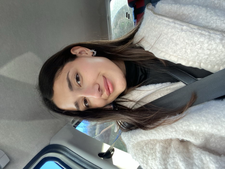 A young woman with long brown hair and light skin sits in a car, wearing a seatbelt and a fuzzy white jacket over a black turtleneck. She is looking at the camera with a slight smile. Her right earring is visible, and the car's interior is plain. Outside the window, a glimpse of trees and blue sky can be seen. The photo is taken at a tilted angle.