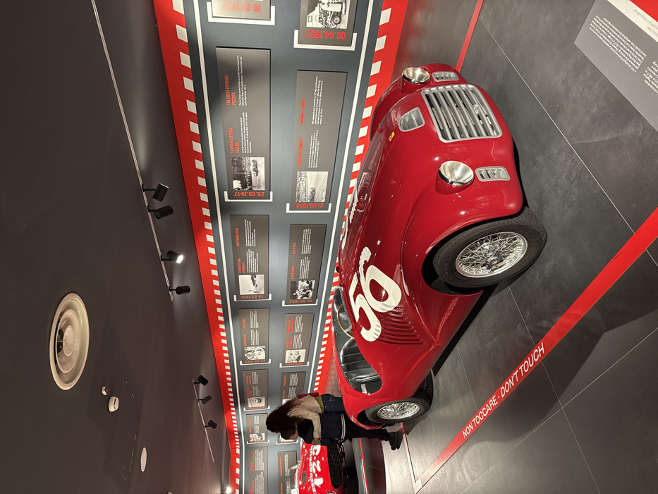 The image displays an indoor museum exhibit located at the Museo Ferrari in Maranello, Italy