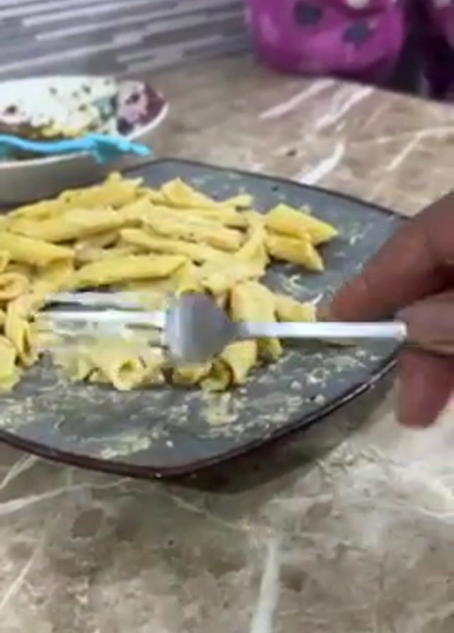 A person is using a fork to mix a plate of penne pasta covered in a yellow sauce. The plate is gray with a brown rim and sits on a brown speckled countertop. Behind the plate is a small dirty dish with a blue spoon and a pair of purple pajamas with white hearts. The wall behind the countertop is tiled.