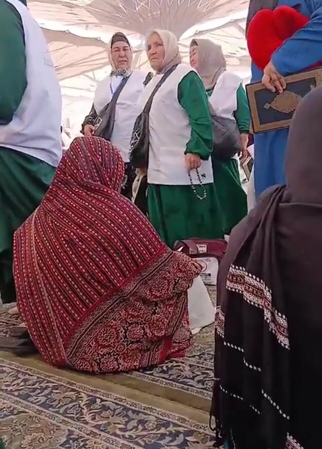 A group of women are congregated indoors under a large white awning-like structure. They are standing and sitting on an ornate patterned rug. Several of the women are wearing similar outfits consisting of a green dress with a white vest. One woman kneeling wears a red and brown striped covering. A woman to the right is holding a book and a red heart-shaped pillow. Several of the women are wearing head coverings.