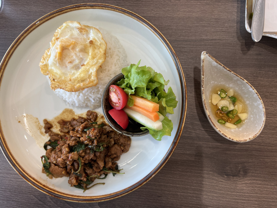 A plate displays rice topped with a fried egg, accompanied by a serving of stir-fried meat with basil and a small bowl of lettuce, tomatoes, carrot, and cucumber sticks