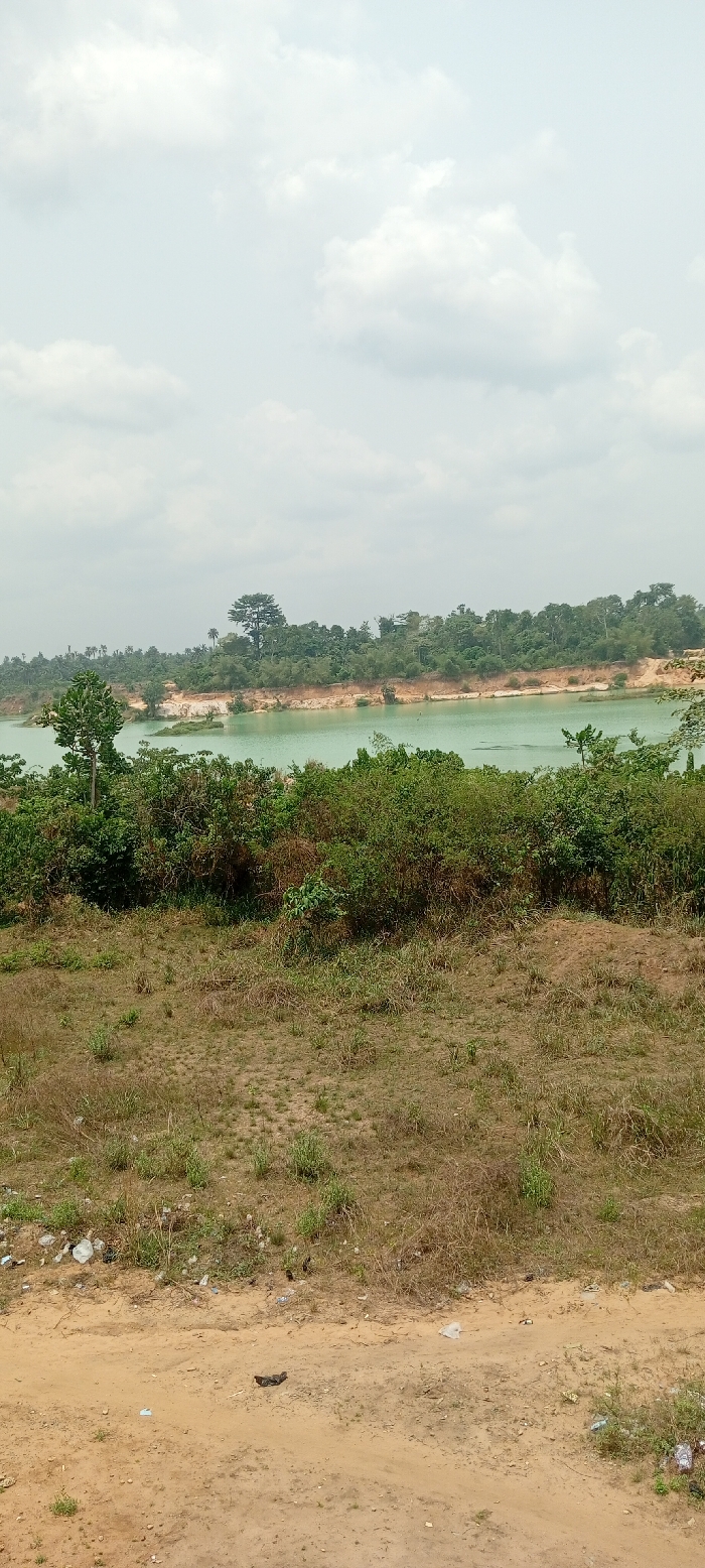 The image presents an outdoor, rural landscape under an overcast sky, located in Unknown, Unknown. The foreground consists of a light brown dirt path or unpaved track, bordered by sparse dry grass and scattered refuse, including various plastic bags. Immediately beyond this, an elevated area features dense, mixed green and dry brown shrubbery and undergrowth. In the midground, a light turquoise-green body of water is visible, with steep, light brown earthen banks suggesting excavation or significant erosion. A small, vegetated island is present within the water on the left side. The background features a dense forest composed of numerous green trees, including a prominent tall, dark green tree on the distant bank, extending across the horizon. The sky is largely overcast with diffused white clouds. No individuals, animals, structures, or active human interactions are depicted within the scene.
