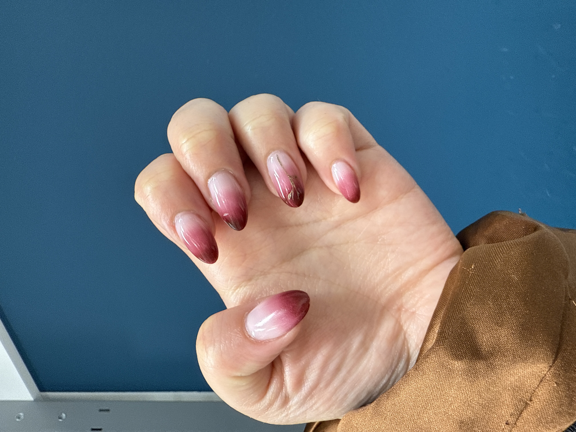 A close-up shot displays a human hand with meticulously manicured nails, set against a blurred backdrop of a solid blue wall. The nails are almond-shaped and feature a gradient design that transitions from a light, milky base to a rich burgundy at the tips. One nail has fine gold-toned embellishments that resemble a stem with leaves. The hand is slightly cupped, with the fingers gently curved. Part of a brown garment, possibly a jacket sleeve, is visible on the right side of the frame. The location is not discernible from the provided image.