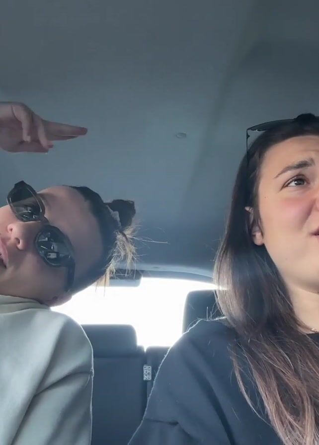 Two young women are in a car. One is driving, and the other is in the passenger seat. They are both lip-syncing and gesturing to music playing in the car. The driver has sunglasses on top of her head and is wearing a black shirt. The passenger is wearing sunglasses and a light-colored hoodie. The interior of the car is visible, including the dashboard and seats.