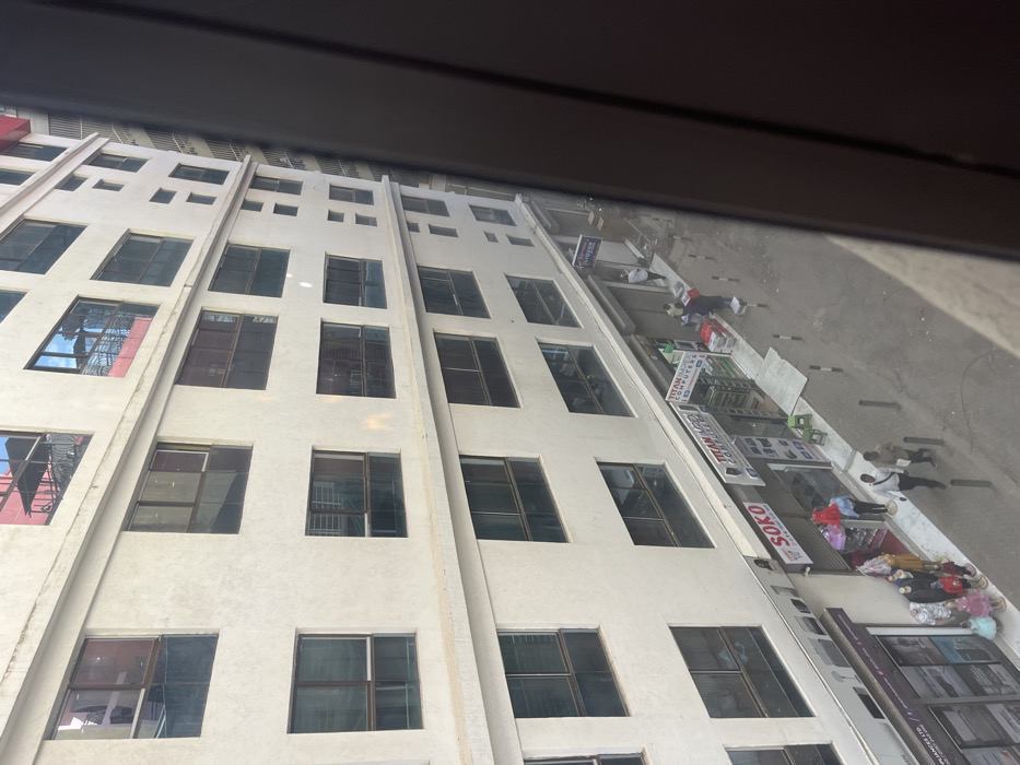A tall, light-colored building with multiple rows of windows dominates the scene. Street-level storefronts are visible along the building's base, with signs like "SOKO" and "TITAN COMPUTERS" displayed. People are walking on the sidewalk in front of the shops, with some items possibly displayed on the ground. The view appears to be from an elevated position, possibly looking down from another building.