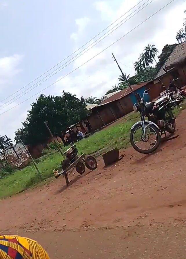 view from what appears to be a moving vehicle. The camera faces towards the side, capturing the scenery passing by. The road is a reddish-brown color, and there are buildings and greenery on the side of the road. There are also power lines visible in the sky. The sky is partly cloudy. A person wearing a yellow, red, and black patterned shirt is visible in the lower right corner of the frame.
