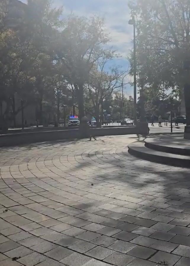 public space with a circular patterned brick plaza. The sun is bright, creating glare and obscuring details. Trees with autumnal foliage line the perimeter of the plaza. In the background, on the other side of a low barrier, two police vehicles with flashing red and blue lights are visible. Other vehicles and a bus are also present. People can be seen walking in the distance, and a person rides an e-bike. The camera is mostly stationary.