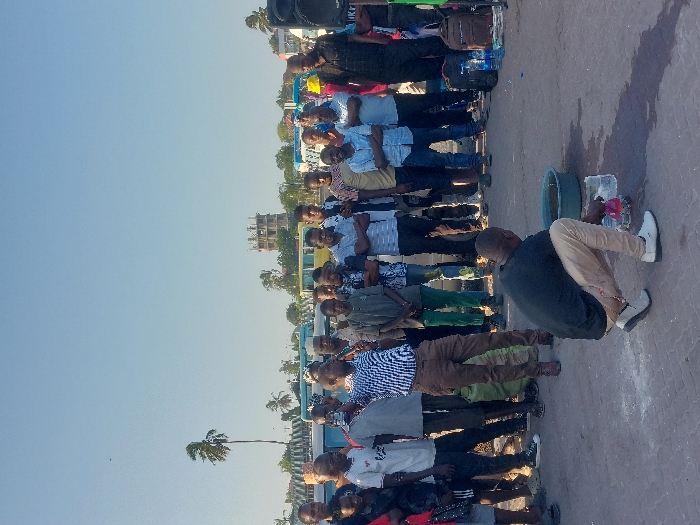 A group of about twenty people are standing outside. Most of the people are wearing collared shirts and pants. One person is kneeling and appears to be pouring water into a bucket. Behind the group are palm trees, a building under construction, and a blue bus. There is a large black speaker in the background.