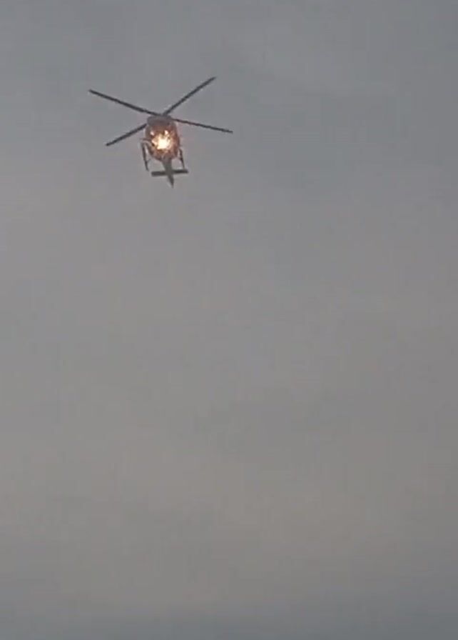 A helicopter is flying in a gray sky. The helicopter is viewed from below, appearing small against the overcast sky. Its rotor blades are clearly visible, and it has a distinct tail rotor. A bright light shines from the front of the helicopter. The sky provides a neutral, somewhat dull background, emphasizing the aircraft.