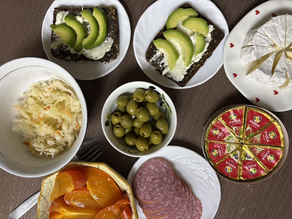 The image presents an overhead view of a varied food spread arranged on a dark brown wooden table, located in Ust-Ilimsk, Russia. In the upper left quadrant, a patterned ceramic dish contains numerous slices of orange-hued fruit, likely cooked persimmons, with a silver fork partially visible beside it. Adjacent, a white bowl holds a portion of shredded sauerkraut. To the right, two small white rectangular plates each feature a slice of dark, seeded bread topped with a white creamy spread and multiple slices of green avocado. Below the sauerkraut, a small white bowl adorned with "Olive" text and olive motifs is filled with whole green olives. To the left of the olives, a white circular plate displays several overlapping slices of pinkish-red salami. In the lower left, a circular cardboard container encases eight individual wedges of 'Viola' brand processed cheese, each wrapped in red and gold foil with Cyrillic labeling. The lower right section features a white plate with small red heart patterns along its rim, holding a round of white-rinded cheese, likely Brie or Camembert, which has been partially cut into wedges. No people are visible in the scene; the food items are arranged for consumption.