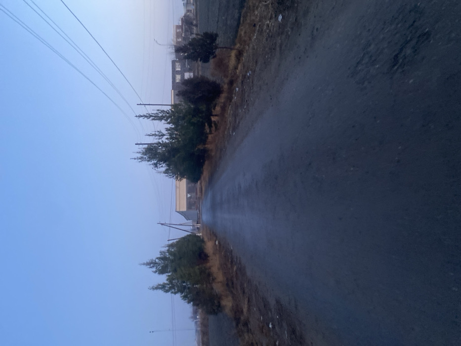 A damp road stretches forward under a muted blue sky. On the left, trees and shrubs line the roadside, merging with buildings in the distance. Power lines run above. The road's surface reflects the ambient light, emphasizing its wet condition. The scene evokes a sense of quiet solitude.