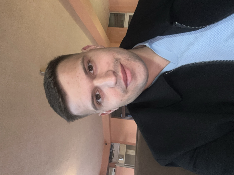 A single adult male is depicted in a head-and-shoulders portrait, positioned centrally and looking directly at the camera with a slight, closed-lip smile. He has short, dark hair with a faded style on the sides, dark brown eyes, and a light complexion with minimal facial hair. The subject is wearing a black collared jacket over a light blue V-neck top that features a textured, possibly waffle-knit, pattern. The scene is set indoors, at a location within the city of Rudozem, Bulgaria. The background features a light peach-colored ceiling and walls, accented with lighter orange architectural trim. Visible objects in the background include a white wall-mounted air conditioning unit on the left and a small dark rectangular device, consistent with a security camera, near the ceiling. A dark brown element, possibly a piece of furniture or a partition, is present behind the subject's left shoulder, and a dark-framed window or doorway is visible on the right side of the frame. The lighting suggests an interior, ambient illumination.