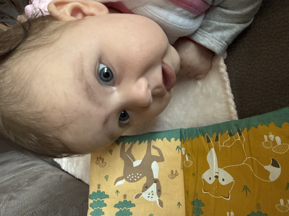 The image captures a close-up, high-angle view of an infant positioned diagonally across the frame. The infant, with fair skin, prominent blue eyes, light brown hair, and slightly parted lips, is looking directly forward. It wears a light grey long-sleeved top with a visible pink band or lining around the neckline area. The infant is lying on its stomach, with its head lifted, appearing to be engaged in 'tummy time'. To the infant's left, a soft fabric item, likely a book or playmat, is visible. This item features a yellow background with green borders and illustrations, including a fawn lying down and a fox, both accompanied by small green trees and mushrooms. The infant is resting on a textured, light cream-colored blanket or mat with a distinct pink crocheted or knitted edge. This blanket is situated on a darker, possibly grey or brown, upholstered surface. A blurry, dark grey upholstered object is visible in the upper left background. The specific indoor location in Burgas, Bulgaria, cannot be determined from the visual information provided.