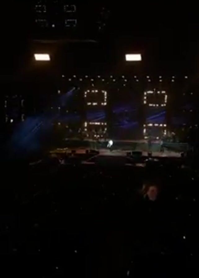 A concert performance takes place on a stage with a large crowd. The stage is tiered and lit with dramatic stage lighting. Behind the central figure, there are multiple square light panels. The backdrop is a large screen displaying abstract blue and purple designs. The central figure, possibly a singer, is wearing a white jacket and dark pants, standing alone on the stage. Behind the singer, a band or musical group is playing instruments. The audience is visible in the foreground, packed tightly together.