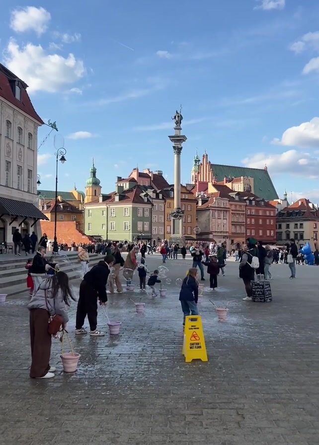 sunny day in what appears to be a historical square in Warsaw, Poland, with many people around. Several children and adults are playing with bubble wands, each with a bucket of bubble solution in front of them. They are making large bubbles that float in the air. Several buildings and landmarks are visible in the background, including the Royal Castle and the Sigismund's Column. The ground is cobblestone and slightly wet from the bubble solution. There is a yellow "Caution Wet Floor" sign nearby. Many tourists and locals are seen walking around, enjoying the spectacle.