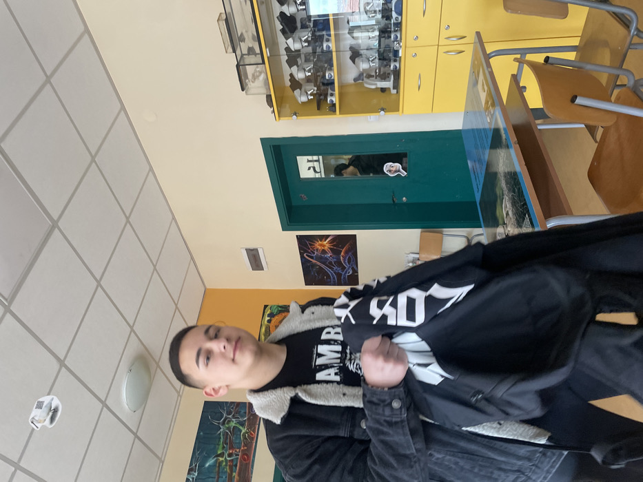 An interior view of a classroom or laboratory located in Panagyurishte, Bulgaria. A male individual, appearing to be in his late teens or early twenties, stands in the foreground, facing the camera with a neutral expression. He has short, dark hair and a fade haircut. He is wearing a dark denim jacket with a light-colored (likely sherpa or fleece) collar and lining, over a black t-shirt with partial white lettering ("AMB" is visible). He holds a black backpack or bag with white graphics in front of him with both hands. In the background, a reflection of another individual wearing a dark jacket is visible within the small window of a dark green door. This door is centrally positioned on the cream-colored wall. A white sticker depicting a cartoon character's face (resembling Elsa from Frozen) and a smaller dark sticker are affixed to the lower part of the door's window. The number "21" is visible reversed on the door's window. To the right of the door, a tall, yellow storage cabinet with multiple glass-fronted shelves displays numerous scientific items, including several microscopes and various small clear containers holding specimens. The lower section of the cabinet consists of solid yellow doors with silver handles. Two student desks with metal frames, light-colored tops featuring a blue laminated overlay (possibly a map or scientific diagram), and attached wooden chairs are visible in the midground. The walls are painted light yellow, with an accent section on the left painted orange. Scientific posters or framed illustrations depicting abstract biological or neurological structures adorn the walls. A small, light-colored rectangular sign is mounted on the cream wall above the green door. The ceiling is a white drop ceiling with square acoustic tiles, featuring two circular flush-mount light fixtures and a white square sensor/detector. The room is brightly lit.