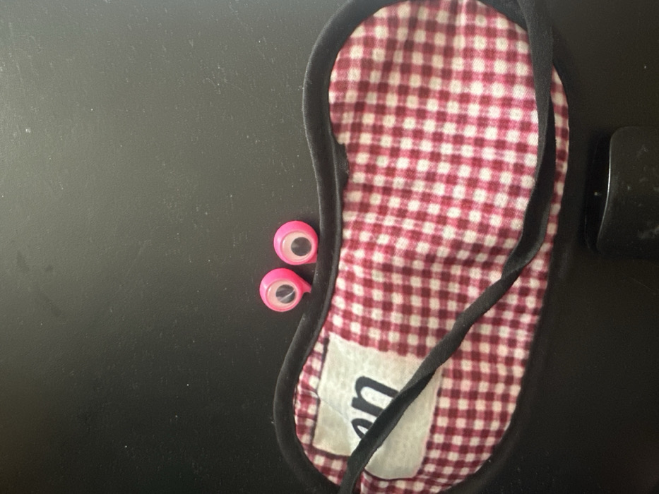A red and white checkered sleep mask with a black trim and elastic strap sits on a black surface. A white tag with a partially visible letter "n" is sewn onto the mask. Two small, pink googly eyes are positioned next to the edge of the mask, creating a comical effect. A black object is visible near the top right corner of the frame.