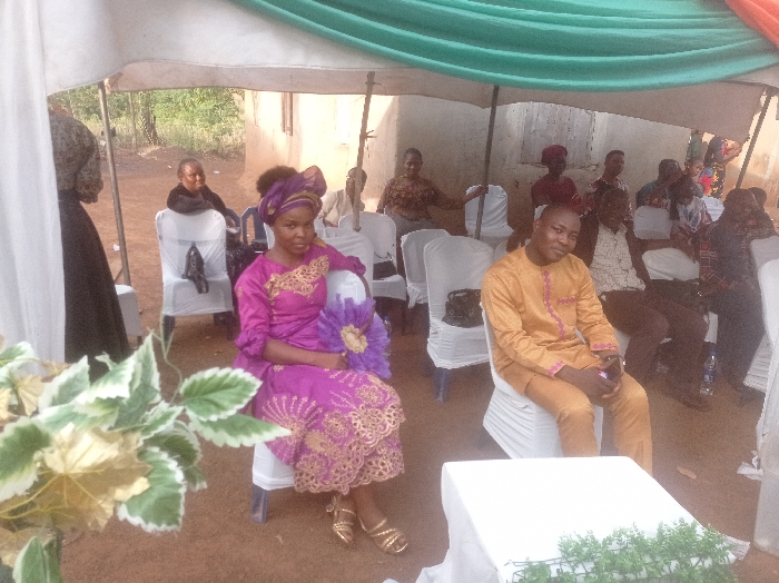 This image depicts an outdoor gathering in Ugbongha, Nigeria, under a temporary tent structure with white and green fabric overhead