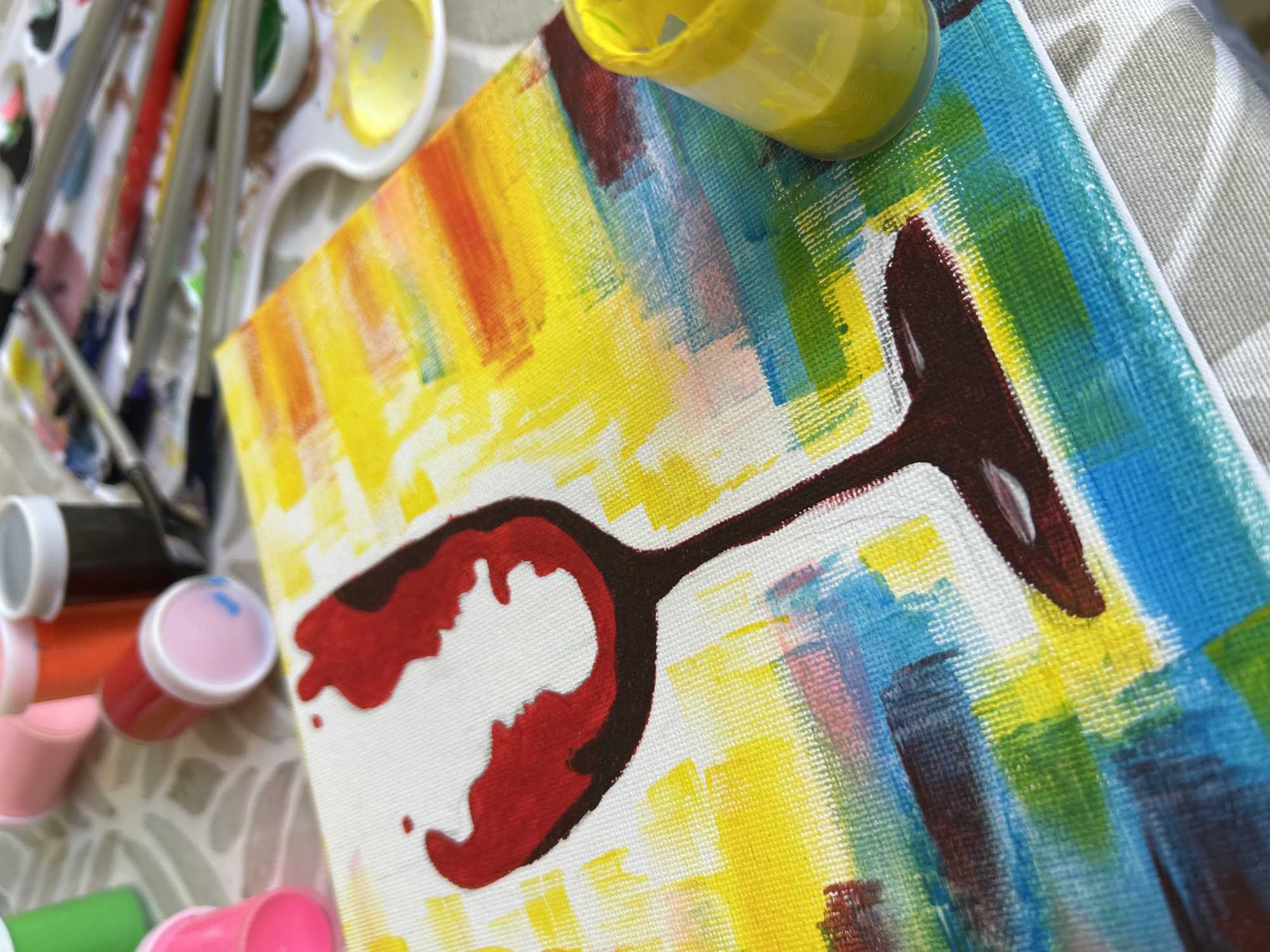 A close-up, slightly angled shot captures a painting in progress, depicting a stylized wine glass against an abstract background of bold brushstrokes