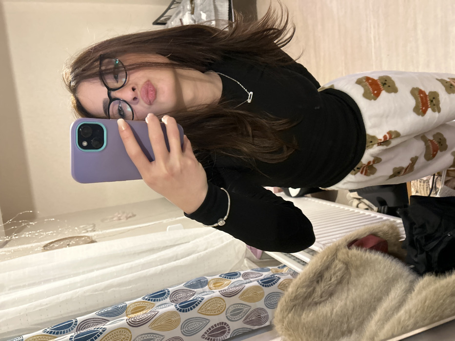 A young woman with long brown hair and glasses takes a selfie. She wears a black long-sleeved shirt, a silver necklace and bracelet, and teddy bear-patterned pajama pants. She holds a purple phone case. The background includes a white ruffled surface, a patterned fabric, and a beige furry item.