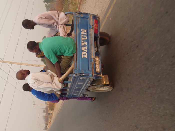 A blue three-wheeled utility vehicle, identified by the brand "DAYUN" on its tailgate and rear mudflap, is observed in motion on a paved road in Adankolo, Nigeria. Four adult males are seated as passengers within the open cargo bed of the vehicle. The individual on the far left wears a blue shirt and purple trousers, facing forward. To his right, a bald man in a light-colored tunic and light brown trousers faces right. A third man, centrally located, wears a green polo shirt and olive green trousers, sitting on a coiled light-colored pipe, facing slightly right. The fourth man, on the far right, wears a light pinkish-beige tunic and faces left, seemingly interacting with the man in the green shirt. The road features a dark gray asphalt surface with a lighter shoulder line to the right, bordered by a dirt and dry vegetation area. Utility poles with overhead power lines are visible along the left side of the road, receding into the background. The sky is uniformly hazy and light grey.