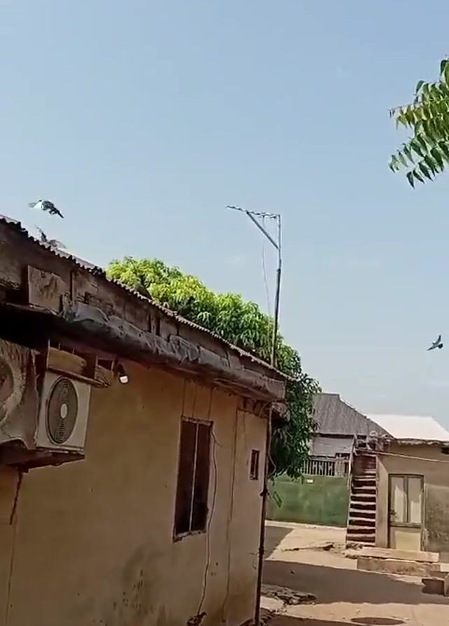 rural landscape. In the initial shot, two pigeons are seen flying above a one-story building with a corrugated iron roof. The building is painted in an earthy tone and has a visible air conditioning unit protruding from the wall. A ladder leans against the side of the building, and a dirt path leads to another similar structure in the background. A tall, slender tree with green foliage is present on the right side of the frame. As the video progresses, the camera angle shifts to provide a closer view of the building, highlighting the air conditioning unit and the window. A bird perches on the roof, and the focus shifts to the tree, partially obscuring the building in the background. The sky above is bright with sparse cloud cover.