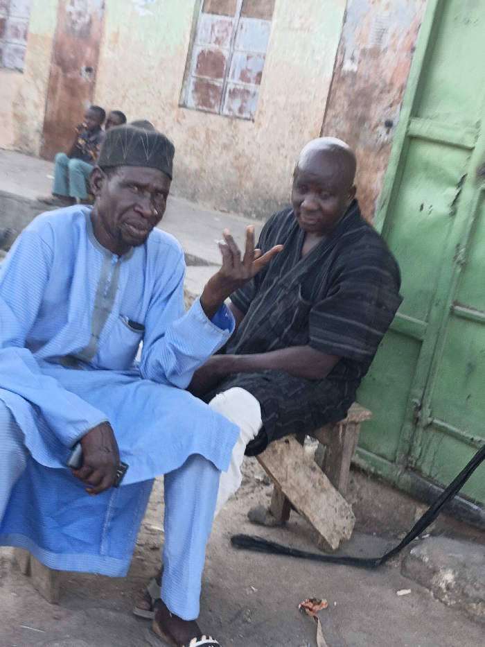 - "The image depicts an outdoor scene in the city of Gawuna, Nigeria, featuring two adult males in the foreground seated on low wooden stools, appearing to engage in conversation" by FM-5oNf52, licensed under CC BY 4.0
