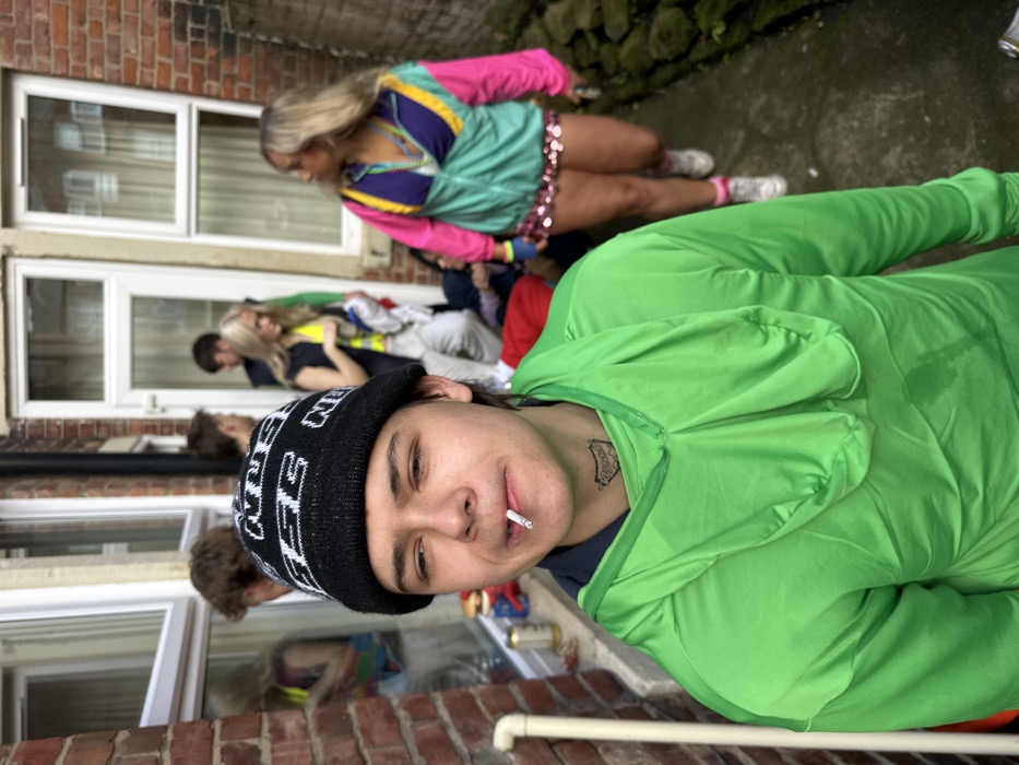 The image depicts a narrow outdoor alleyway or passage between brick buildings in Newcastle upon Tyne, United Kingdom. The ground is an uneven, damp concrete or paved surface, and a low, moss-covered stone wall runs along the right side. The buildings feature reddish-brown brickwork with white-framed windows and doors. In the immediate foreground, a young male with fair skin and dark hair wears a black knit beanie featuring white "NIKE" branding and a bright green hooded long-sleeved top. A lit cigarette is positioned between his lips. A dark, stylized tattoo is visible on the right side of his neck. To the left of this individual, a white vertical pipe is present, and on a ledge below it, red objects and at least two aluminum beverage cans are visible. In the mid-ground, several individuals are present. Two young males are partially visible near a doorway. A young female with blonde hair, wearing a dark sleeveless top over a bright yellow garment and light-colored trousers, is seen holding a white item. To her right, another young female with long blonde hair walks away from the viewer, looking towards the right. She is dressed in a multi-colored (teal, purple, pink) retro-style tracksuit jacket, a short sparkly pink skirt, pink socks, and white sneakers, with several beaded necklaces around her neck. A partially obscured individual is visible sitting or crouching near the doorway. The reflection of a person in a colorful top is visible in a window on the left. The scene suggests a casual social gathering.
