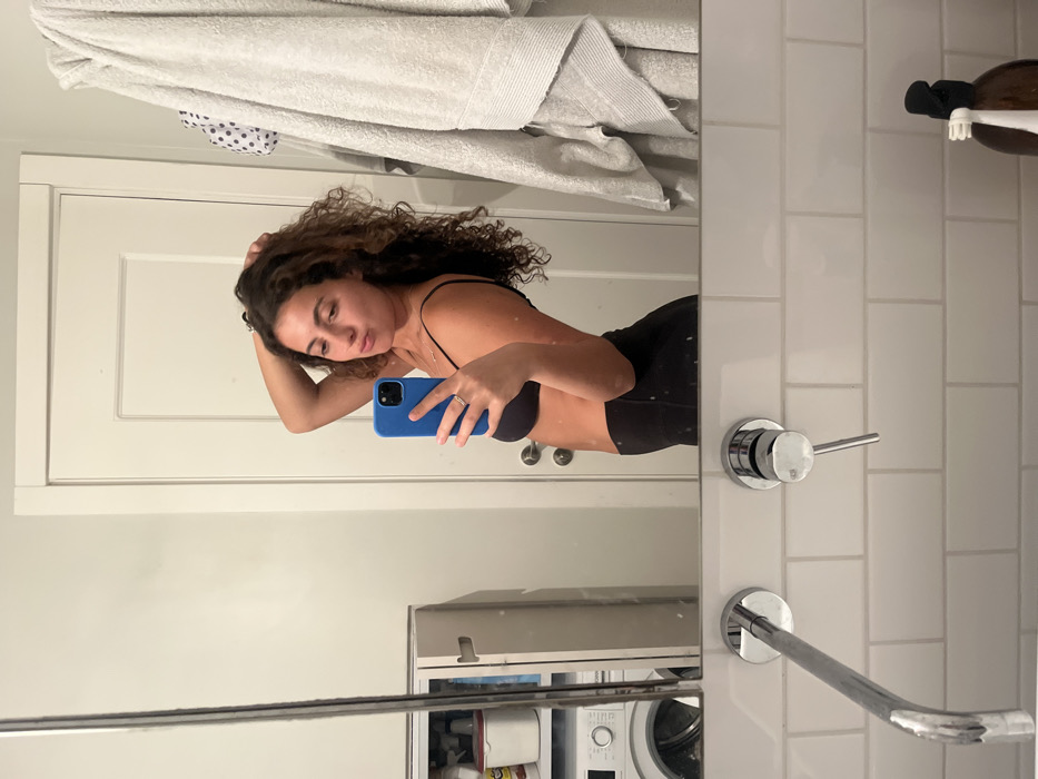 A female subject is captured in a mirror selfie within a modern domestic bathroom in Tel Aviv, Israel. The woman, displaying long, dark, curly hair, is dressed in a black sports bra and black athletic leggings. She holds a blue-cased smartphone in her left hand, which bears a ring on the ring finger, while her right hand is raised and splayed near her head. Her lips are pursed. The background, reflected in the mirror, shows a white panel door with a chrome handle, light-colored towels draped on the right, and to the left, a wall-mounted cabinet containing various bottles above a white front-loading washing machine. The foreground features white subway tiles, a contemporary chrome wall-mounted faucet, and a separate control lever. A dark brown pump bottle with a small brush attached is visible on the counter surface to the far right.