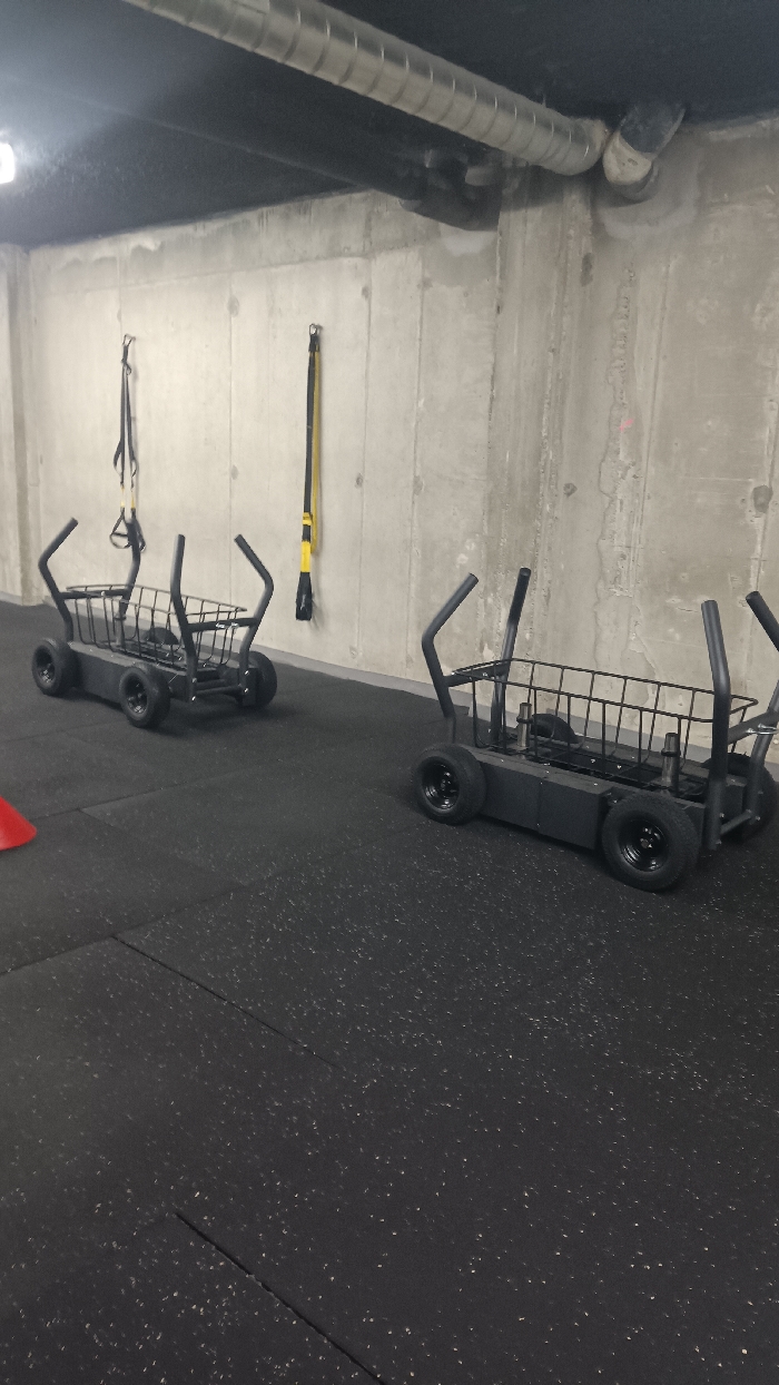 The image depicts an indoor fitness facility located in Sagunto, Spain. The environment features exposed light grey concrete walls with visible formwork lines and dark grey, possibly rubber, modular floor tiling with white speckles. A dark ceiling is present, from which a silver-colored corrugated metal ventilation duct runs horizontally, alongside a black pipe system in the upper right. A single recessed light fixture is visible in the upper left corner. Two black fitness sleds, each equipped with four black wheels, a rectangular base, a wire cage basket, and two U-shaped push handles, are positioned on the floor. The sled in the foreground on the right is fully visible, angled slightly towards the left. A second, identical sled is positioned further back and to the left, partially obscured by the foreground sled. On the concrete wall in the background, two suspension trainers are hanging: one entirely black, and another black and yellow. A small, red conical marker is partially visible on the floor in the far left foreground. No individuals are present in the scene, and no actions or interactions are depicted.