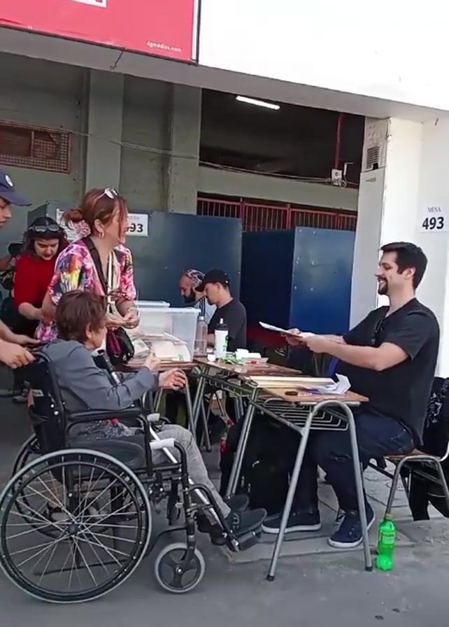 woman in a wheelchair casting her ballot at a voting station. A woman wearing a colorful top and glasses assists her in the process. A person in uniform is helping to guide the wheelchair. A man is sitting at the desk on the right and checking paperwork. A sign above says "SECTOR GALERIA". A table number reads "493". Other people are also present at the voting station.