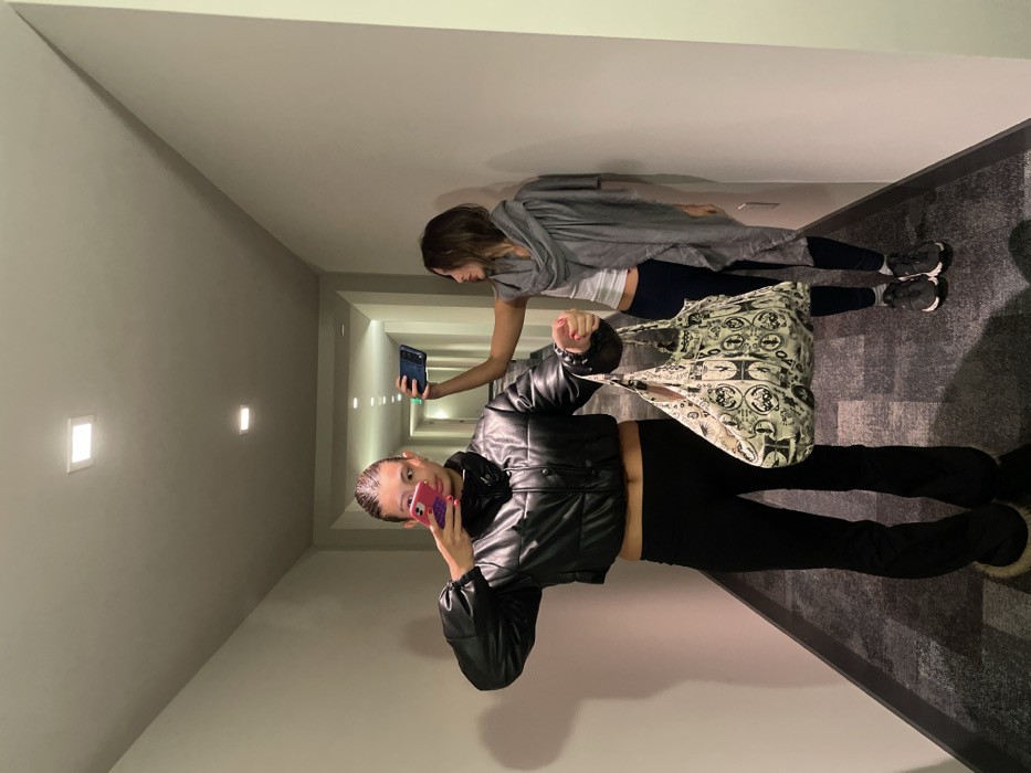 Two young women pose in a brightly lit hallway with grey walls and a dark grey carpet. One woman is taking a selfie, wearing a black puffy jacket and black leggings. She carries a patterned tote bag. The other woman stands behind her, holding her phone up to take a picture. She is wearing a grey wrap, a white shirt, and dark leggings. The hallway recedes into the distance with evenly spaced recessed lights.