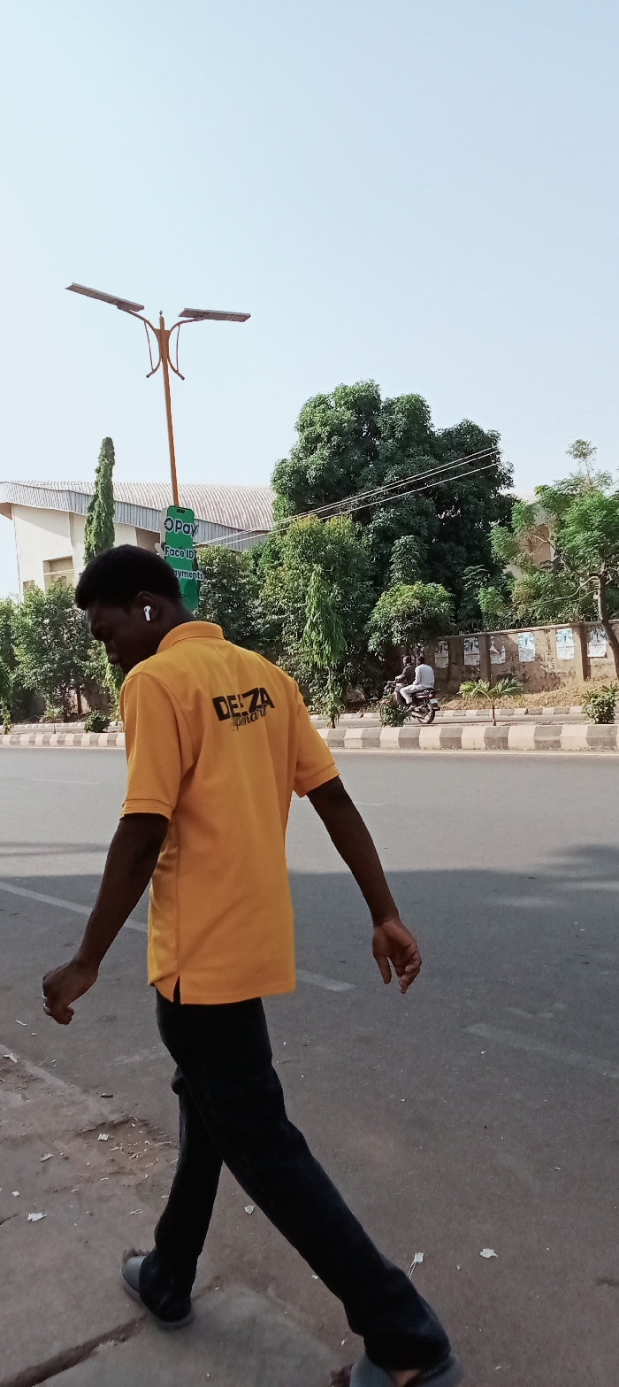This daytime image depicts a street scene in Kabala, Nigeria. In the foreground, a male subject walks left across the frame, viewed from a rear-right perspective. He wears a mustard yellow short-sleeved polo shirt with "DEIZA Smart" printed in black on the back, dark trousers, and white wireless earbuds in both ears. He walks on a dark paved surface. To his left, a paved road is visible, bordered by a black and white striped concrete median. Across this median, a second paved road features a motorcycle carrying two individuals, both male, traveling left. The background includes lush green trees, a low wall partially covered with posters, and a large building with a curved corrugated metal roof. A tall, orange street light pole with two horizontal light fixtures is prominent, along with a green sign displaying "OPay" and "Face ID payments." The sky is clear and light blue.