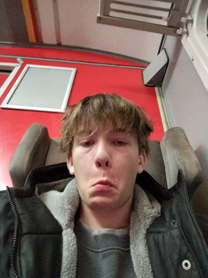 A young man with messy blonde hair sits in a train seat, wearing a gray sweater and a dark jacket with a light-colored, fuzzy lining