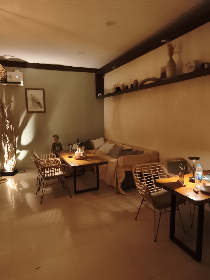 The image depicts an interior view of a dimly lit restaurant or lounge area located in Baan Chaweng, Thailand. The room features a light green wall on the left and a light beige wall on the right, separated by dark brown trim. The ceiling is white with recessed lighting. The floor consists of light-colored tiles. On the left wall, an air conditioning unit is mounted above a framed picture of a bird of prey. Below this, a tall, abstract sculpture made of light-colored wood or branches stands on the floor, illuminated from below by a dedicated floor lamp, casting prominent shadows. Adjacent to this, a small child, wearing a dark t-shirt with "Lee" visible, stands near a wooden dining table with a dark metal base. Two wicker-style chairs with dark metal legs are positioned at this table, which holds a small table lamp and a vase with greenery. Along the right wall, a long, upholstered bench seat is covered with a light brown throw blanket and accessorized with multiple grey and white cushions. Above the bench, a dark brown floating shelf displays various decorative objects, including vases, bowls, and a dried plant arrangement. In the foreground, a second wooden dining table with a dark metal base is visible. One wicker-style chair is placed at this table, which holds a small table lamp, a clear plastic water bottle, a menu stand, and a white bowl. No direct interactions are occurring.