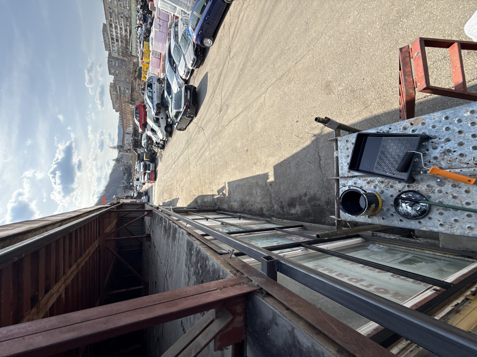 The image depicts an exterior scene in Gabrovo, Bulgaria, captured from an elevated perspective, likely a scaffold. In the immediate foreground, on a metal scaffolding platform, painting tools are present: a black paint can with a yellow label containing black liquid, a black paint roller tray also holding black liquid, a paint roller with an orange handle, and a paint-covered stirring stick or brush resting on a lid. Adjacent to the tools, a metal railing section is visible, partially coated in fresh black paint over older, rusty metal. To the left, the side of a multi-story building is shown, featuring exposed reddish-brown steel beams forming structural support for an upper concrete floor. Below this, a series of windows or display panels are visible, some exhibiting faded Cyrillic text, including "ДОГРАМА" (DOGRAMA). The midground and background reveal a large, open-air lot or yard with an asphalt or concrete surface. This area is heavily populated with numerous parked vehicles, primarily cars, vans, and some trucks. Many vehicles appear to be salvaged, damaged, or in various states of disrepair, indicative of a car yard or auto repair facility. Notably, a red car is positioned atop other vehicles. Further back on the right, stacks of white, rectangular construction materials are visible. In the distant background, multi-story residential or commercial buildings are present, with mountains and hills rising beyond them. The scene is illuminated by strong sunlight, casting long shadows across the ground, under a partly cloudy blue sky. No individuals are visible in the frame.