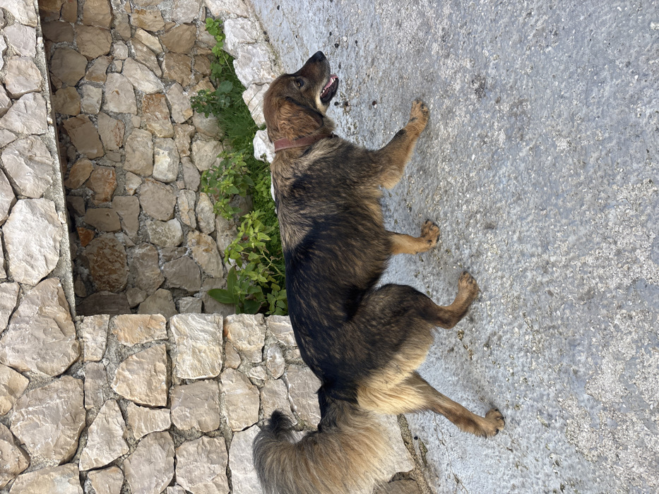 A medium-large mixed-breed dog, predominantly dark brown and black with tan fur on its head, legs, and bushy, curled tail, stands on a textured light grey concrete surface. The dog wears a brown collar, faces right in profile, and its mouth is slightly ajar. In the background, a dry-stacked or mortared stone wall, composed of irregularly shaped light-colored stones, features a rectangular recess on its left side. Green vegetation grows at the base of the wall, behind the dog, bordered by lower stones. The scene is located in Bar, Montenegro.